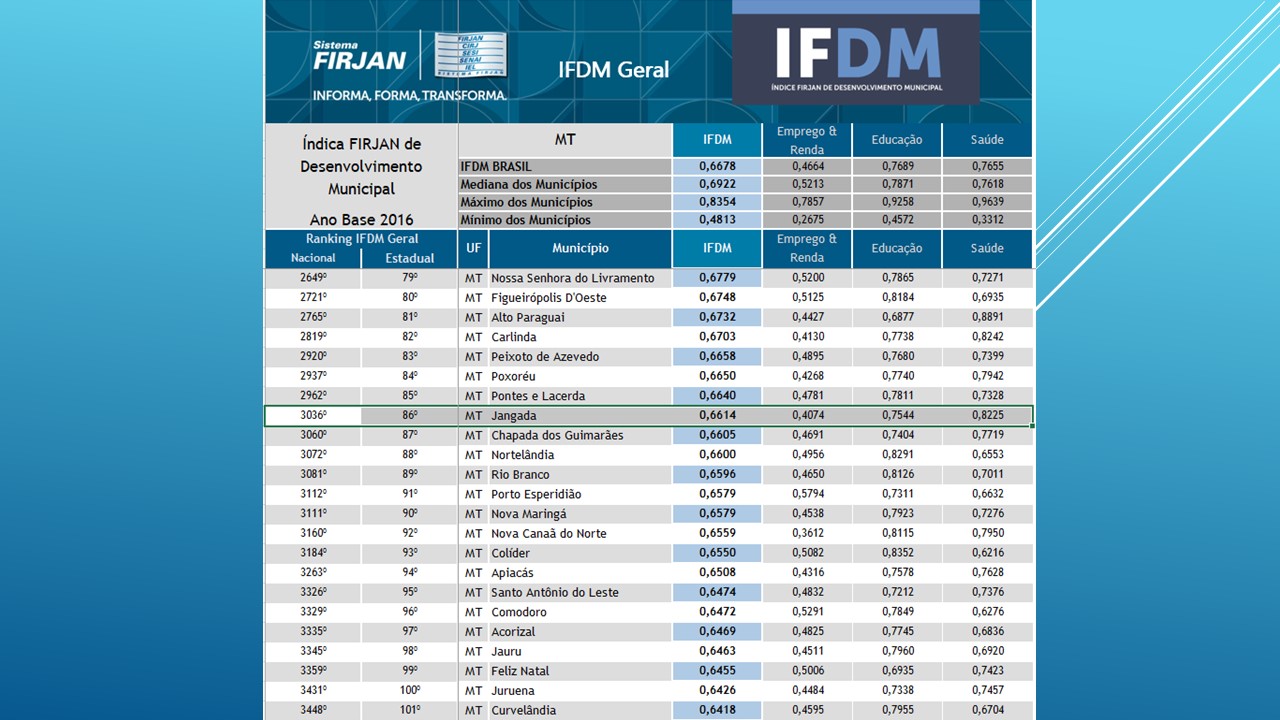 Veja o ranking completo dos 141 municípios de Mato Grosso: http://firjan.com.br/ifdm/consulta-ao-indice/ifdm-indice-firjan-de-desenvolvimento-municipal-resultado.htm?UF=MT&IdCidade=510490&Indicador=1&Ano=2016