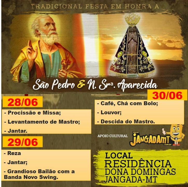 Aos 28 anos de tradição em realização da festa de São Pedro e Nossa Senhora Aparecida na residência da Domingas Porfiria da Silva, popularmente conhecida como Dona Domingas, aos seus 60 anos, vem buscando manter a tradição e cultura religiosa de sua família, que era realizado pelo seu pai, neste ano comemora mais um ano de sua organização, com muita fé e devoção a festividade religiosa.