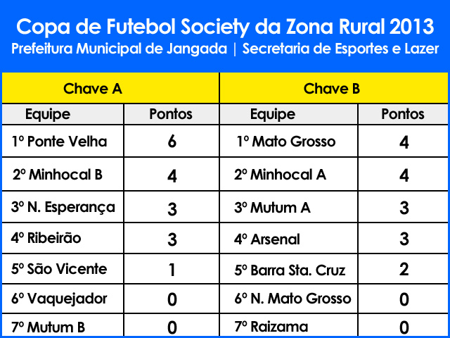 A equipe da Ponte Velha lidera o grupo da chave A, com 6 pontos, seguida do Minhocal B com 4 pontos. Pela chave B, a equipe do Mato Grosso está liderando, empatada com o Minhocal A. Ambas equipes estão com 4 pontos, mas a equipe do Mato Grosso leva vantagem no saldo de gols.