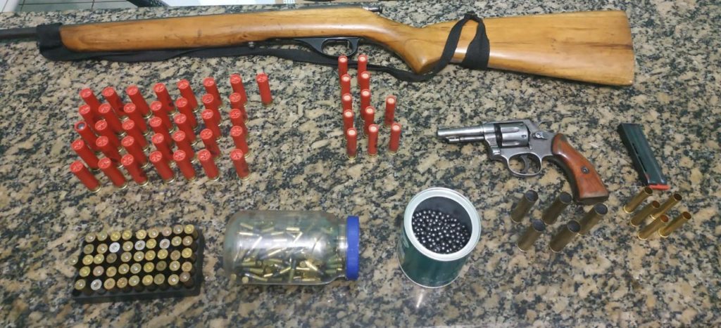 No local foram localizadas uma espingarda artesanal calibre 22, 177 munições calibre 22, 46 munições calibre 38, 12 munições calibre 36, 05 cartuchos metálicos recarregáveis de munição gauge calibre .40, 05 cartuchos metálicos recarregáveis de munição gauge calibre .36, 01 porção de chumbo 3t, 01 porção de chumbo artesanal e 01 carregador de munição calibre 22.