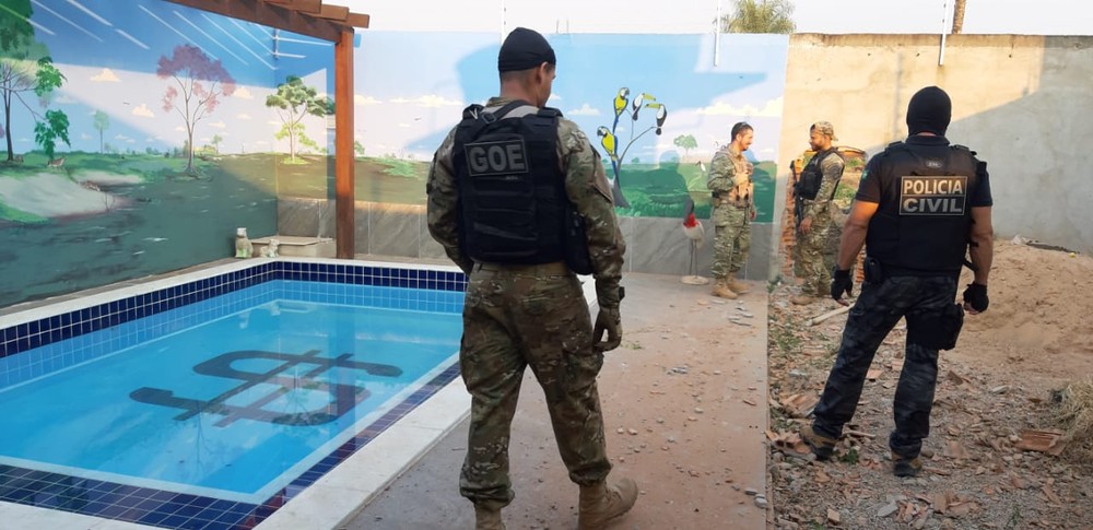 Nos fundos da casa, o criminoso tinha uma piscina onde há um cifrão gravado no azulejo como forma e ostentação.