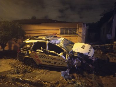 Uma viatura da Polícia Militar ficou destruída após colidir com o muro de uma residência localizada bairro Vila Aurora, em Rondonópolis (218 km de Cuiabá), nesta sexta-feira (22).