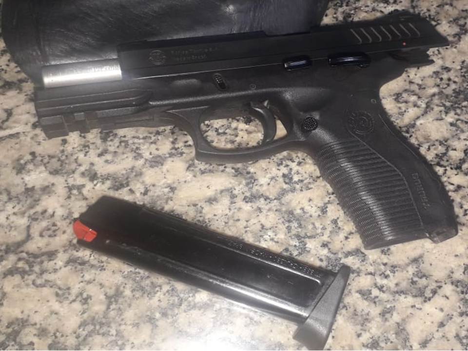 E já durante a busca no veículo do indivíduo foi encontrada uma arma de fogo tipo pistola calibre 380 com munições.