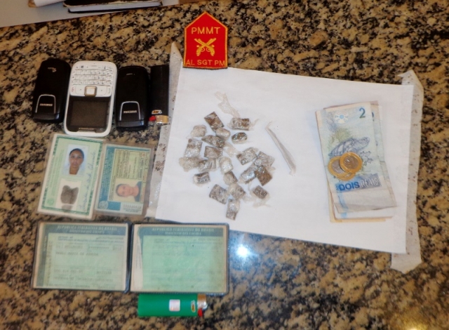 Ao fazer buscas no quintal e na residência a guarnição encontrou ainda 22 trouxinhas de maconha e 71 reais em dinheiro de papel e moedas.