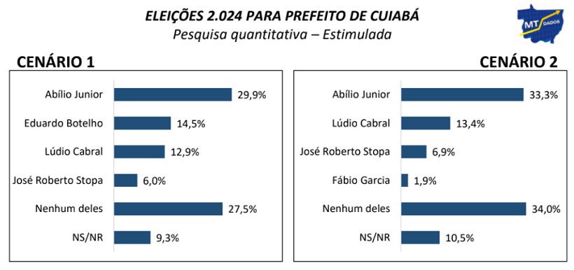 Em um dos cenários analisados pelo MT Dados, o deputado federal Abilio Júnior (PL) lidera com 29,9% das intenções de voto e Eduardo Botelho aparece em segundo, com 14,5%. Neste mesmo cenário, o também deputado estadual Lúdio Cabral (PT) tem 12,9% e o atual vice-prefeito de Cuiabá, José Roberto Stopa (PV), tem 6%. Outros 27,5% disseram que não votariam em nenhum destes candidatos e 9,3% disseram que não sabiam ou não quiseram responder.