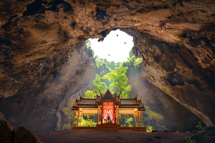 Receber convidados em casa é uma verdadeira arte que poucos dominam. No entanto, esta construção talvez tenha alguma coisa a nos ensinar. Em uma região remota da Tailândia, os próprios moradores desta pequena comunidade decidiram construir o Templo Khuha Kharuehat, quando a cidade recebeu o rei Chulalongkorn – conhecido como Rama V. Dentro de uma caverna, localizada na província de Prachuap Khiri Khan, à medida que os raios de sol penetram, o templo fica dourado, recompensando os visitantes com uma visão espetacular.