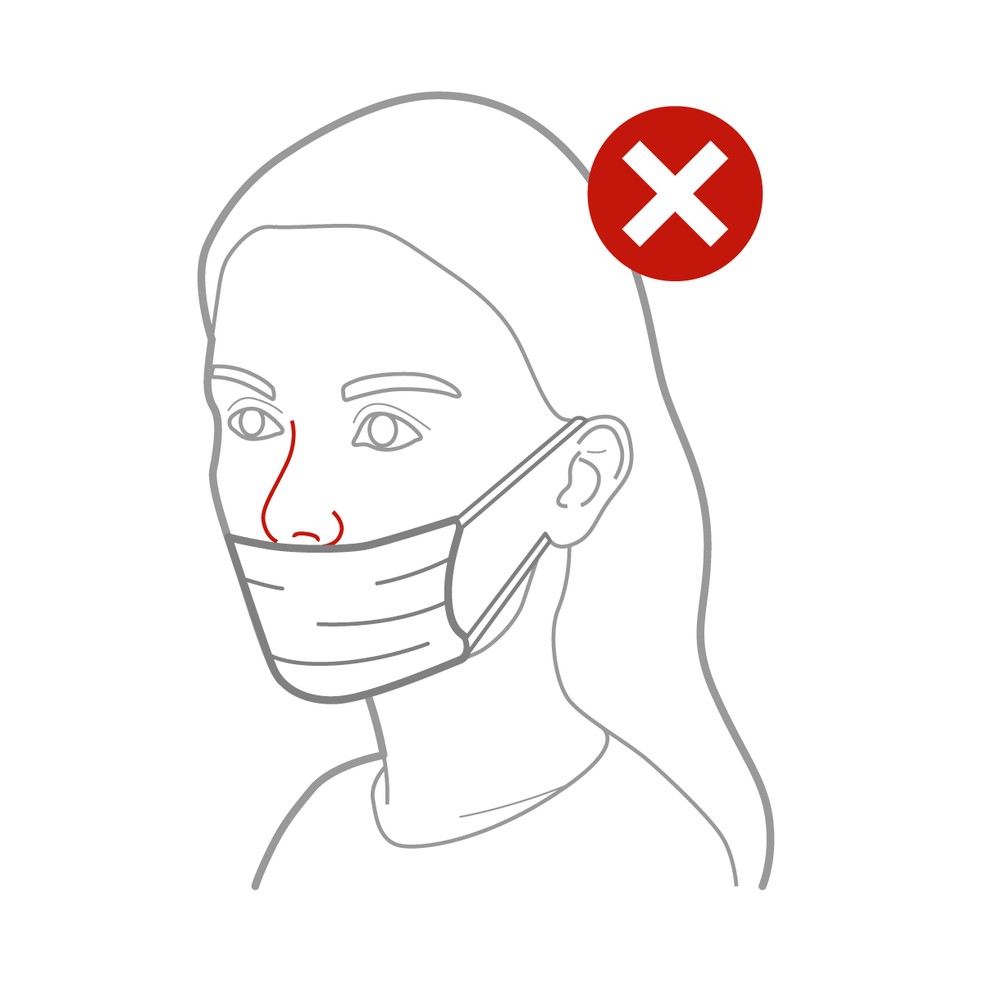 Para que a proteção seja efetiva, a máscara deve cobrir o nariz inteiro, descendo até o queixo, de modo que não sejam formados vãos por onde gotículas possam entrar. O equipamento não vai se mover pelo rosto -- vai moldar-se a ele.