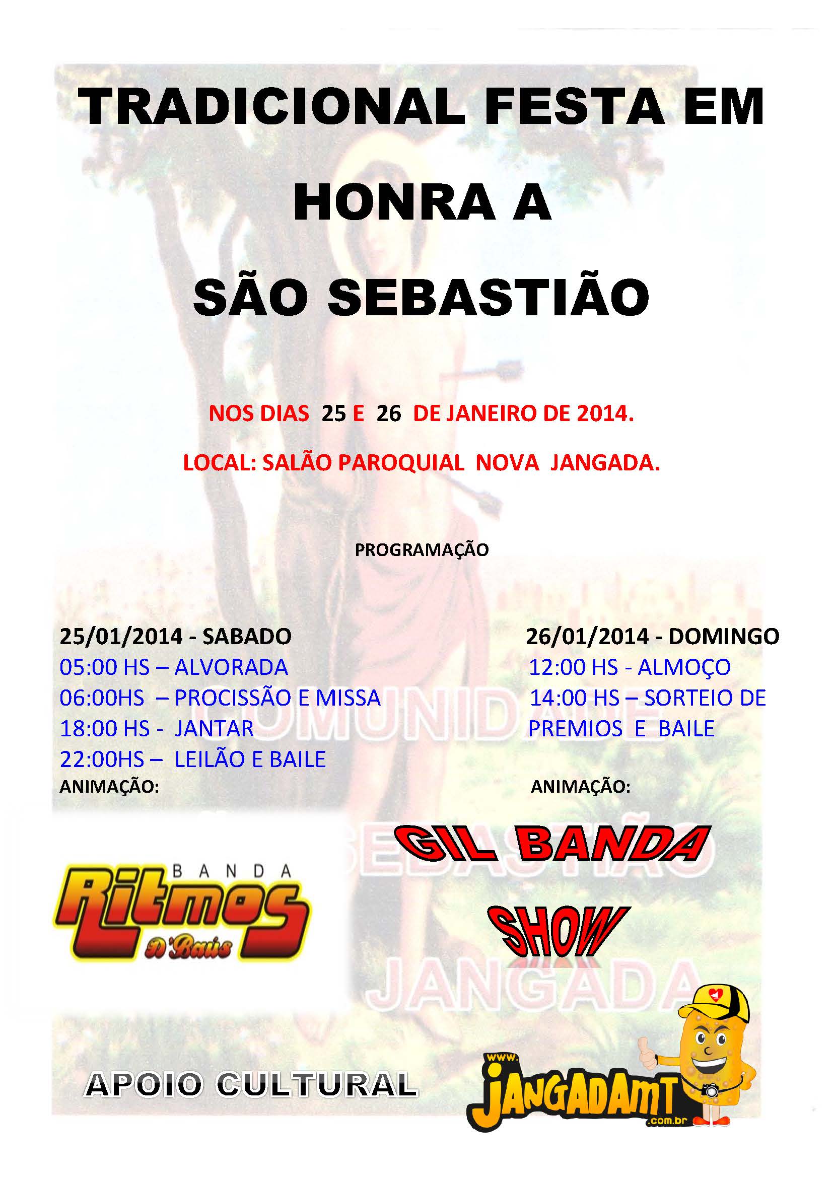 Já no domingo (26.01), a programação começa com almoço ás 12h, e em seguida sorteio de prêmios e baile, a partir das 14 horas com animação de Gil Banda Show. A festa e uma realização dos Festeiros 2013. Apoio e cobertura fica por conta do site JangadaMT.