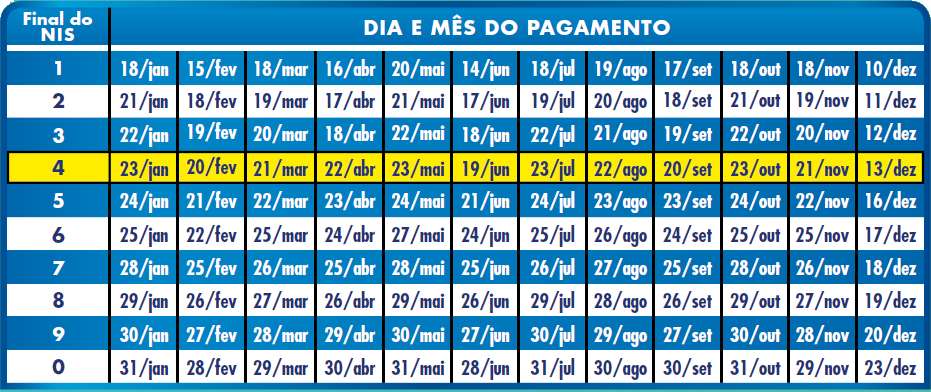 Na imagem abaixo, por exemplo, o destaque em amarelo mostra uma família com o NIS do titular do cartão com final 4. Assim, uma família que possui um cartão com final 4 pode identificar os dias em que seus pagamentos estão disponíveis em cada mês do ano acompanhando a linha para a direita.