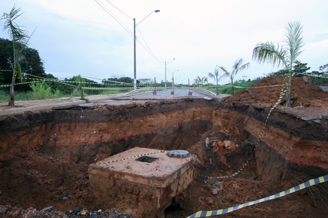 Parte do asfalto da Rua Antônio Dorilêo, localizada no bairro Coophema e próxima à Ponte Engenheiro Quidauguro Fonseca, desmoronou nesta terça-feira (18). O trecho é considerado obra da Copa do Mundo e foi inaugurado há quatro meses, no dia 29 de outubro, pelo governador Silval Barbosa (PMDB).