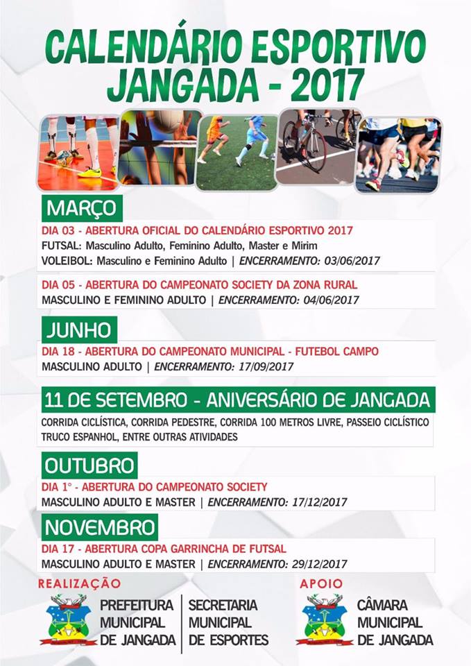 A Prefeitura de Jangada, através da Secretaria Municipal de Esporte e Lazer, abrira a programação do Calendário Esportivo 2017 com o início do Campeonato Municipal de Futsal, ocorrera na noite desta sexta-feira (03), a partir das 18h, no Ginásio Municipal, com a participação de 500 atletas disputando as categorias masculino e feminino.