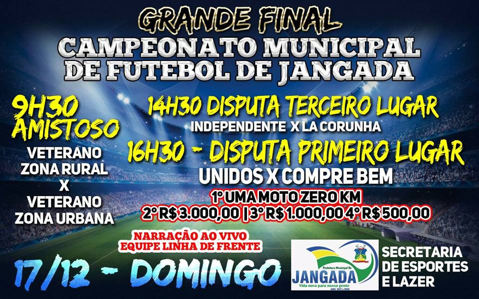 Após partidas acirradas no último sábado (09) e domingo (10), saíram os dois finalistas do Campeonato Municipal de Futebol Amador de Jangada: Unidos e Compre Bem, que decidem o título no dia 17 de dezembro, a partir das 16:30h, no campo municipal. A disputa do terceiro lugar ficou entre o Independente e La Curunha, a partir das 14:30h.