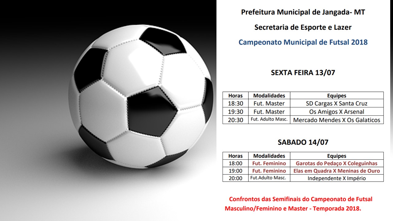 O Campeonato Municipal de Futsal já está terminando, por isso, não perca a Semifinal que irá acontecer nesta sexta (13) e sábado (14), a partir das 18:30 horas.