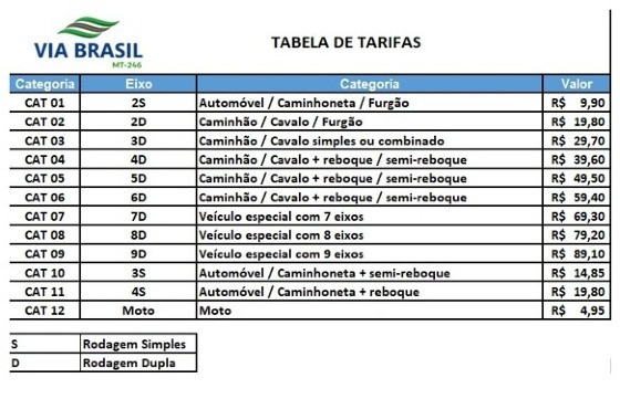 Os valores do pedágio nas rodovias que perfazem o trecho entre Jangada (76 km de Cuiabá) e o Distrito de Itanorte, em Campo Novo do Parecis (397 km de Cuiabá) foram reajustados no último sábado (2). De acordo com a concessionária, trata-se de 233 km em quatro rodovias estaduais - MT-246, 343, 358 e 480. O aumento foi de 3,12% e, com isso, o valor da tarifa básica passou de R$ 9,60 para R$ 9,90.