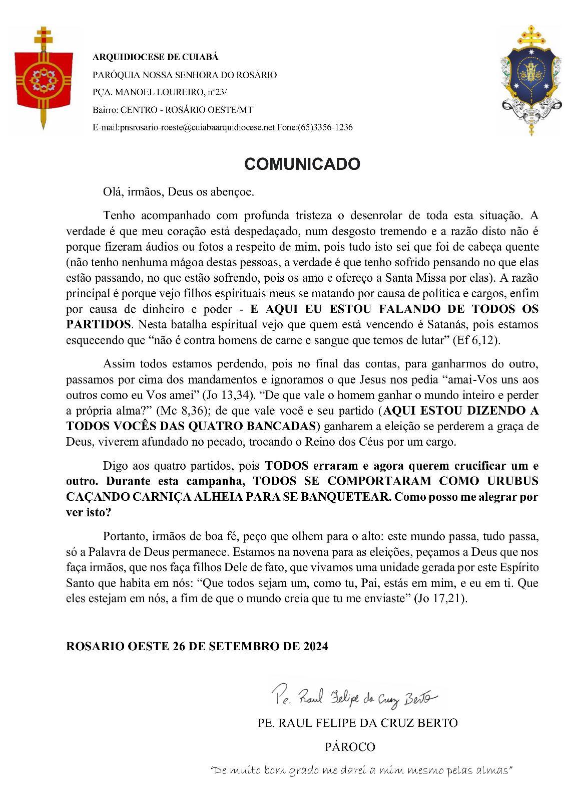 Padre Raul emite comunicado sobre as eleições em Rosário Oeste