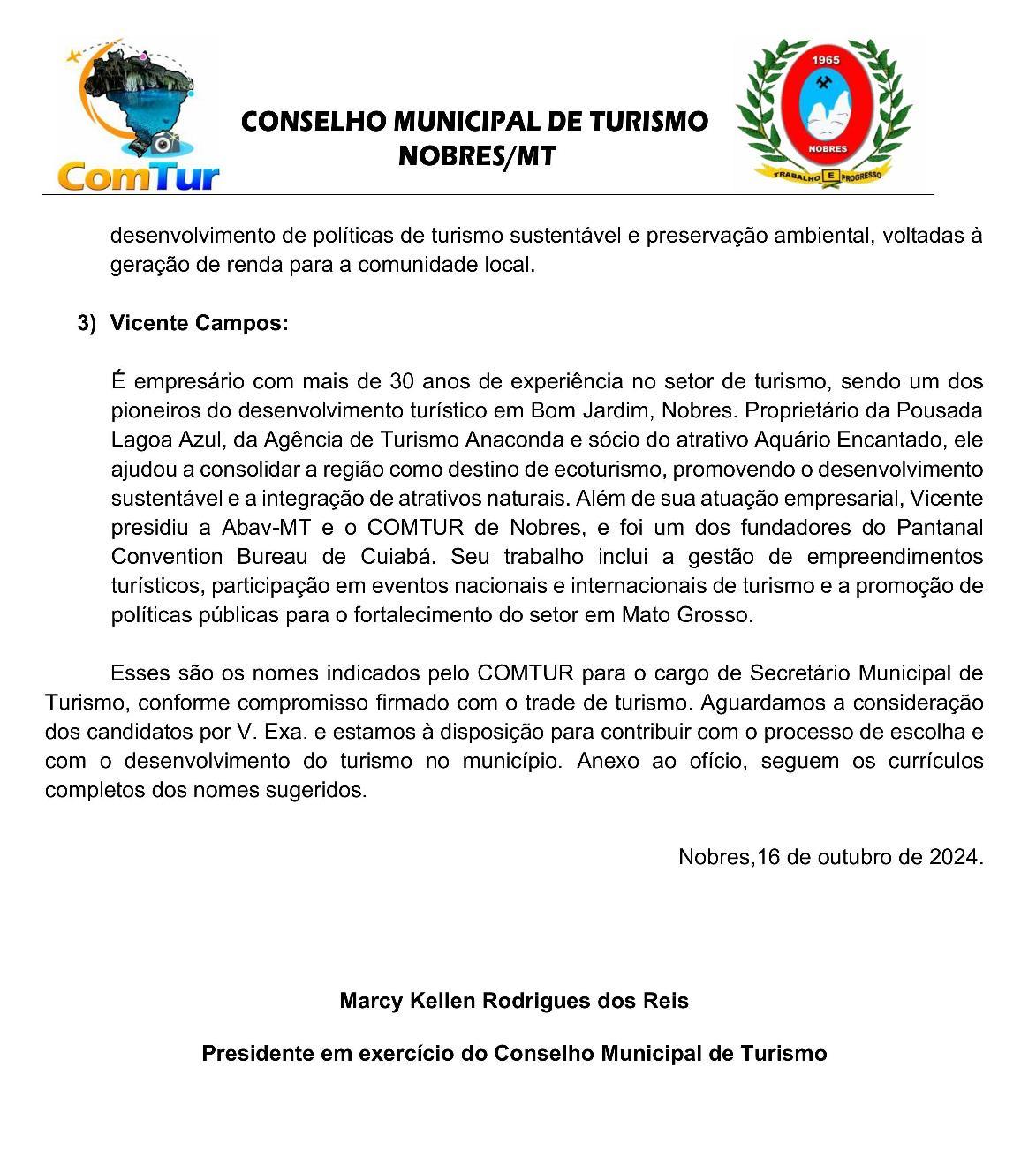 O documento com o currículo dos três pretendentes ao cargo foi encaminhado para o Prefeito eleito sendo assinado pelo Presidente do Conselho Municipal de Turismo de Nobres, Sr. Marcy Kellen Rodrigues dos Reis.
