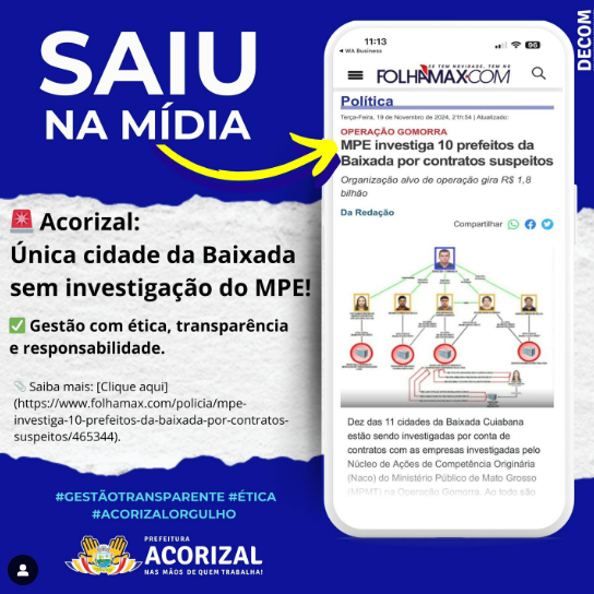 "Essa informação da Imprensa reflete o trabalho sério da nossa gestão que respeita a confiança do povo na nossa reeleição. Nossos contratos com fornecedores buscam a transparência, a legalidade e o melhor para desenvolvimento do municípios de Acorizal”, afirma o prefeito.