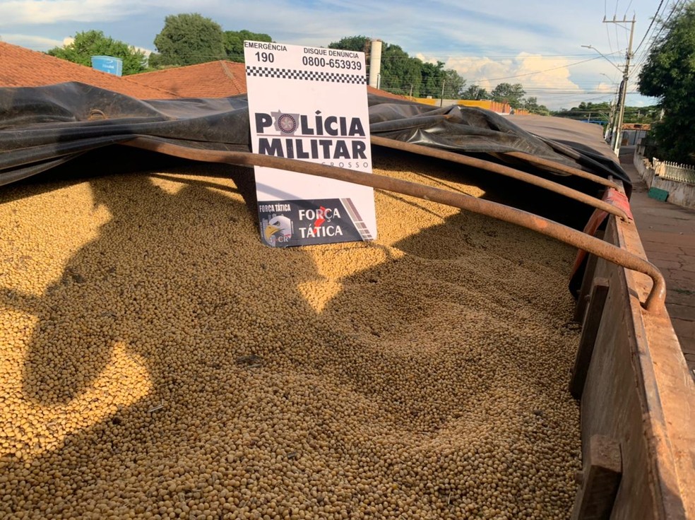 Uma carreta com 49 toneladas de soja que foi furtada por uma quadrilha foi apreendida na noite dessa quinta-feira (11) por policiais da Força Tática de Rondonópolis, a 218 km de Cuiabá.