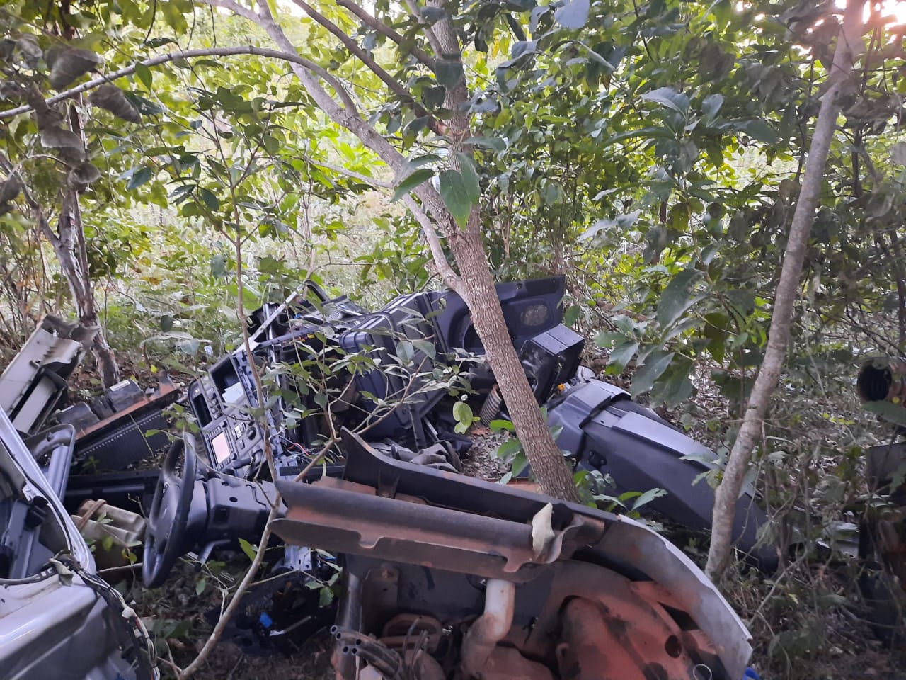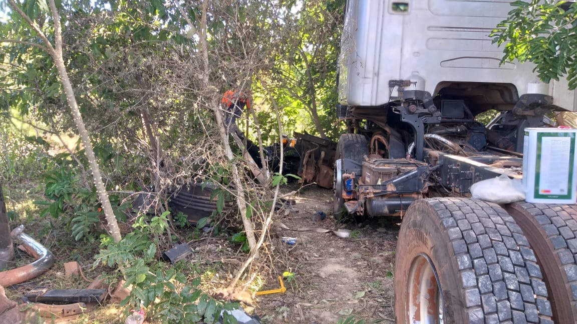 O veículo estava desmontado e suas peças espalhadas pela região. As diligências policiais continuaram durante a noite, quando foram detidos dois indivíduos na área de Jangada pelas margens da rodovia federal, que afirmaram estar trabalhando no desmanche do caminhão-trator recuperado.
