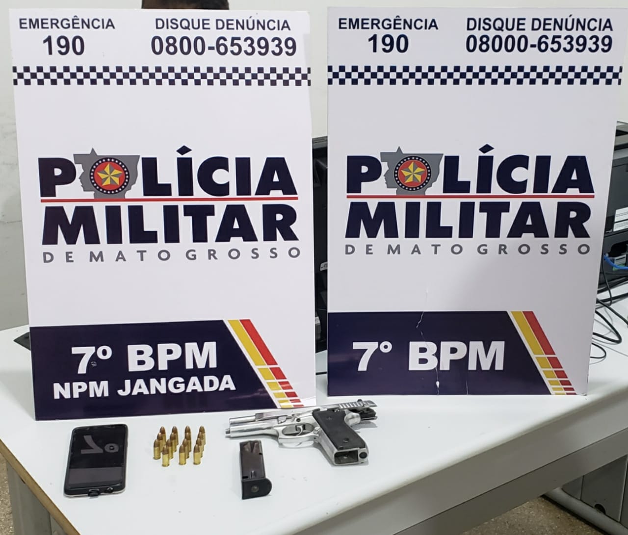 Aos militares o detido de 35 anos informou que a arma de fogo e munições eram suas e que estava em zona rural de Jangada por estar foragido da justiça.