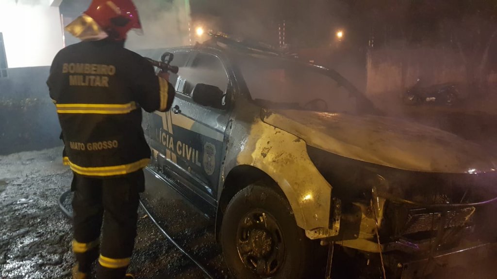 Na madrugada desta terça-feira (6), criminosos atearam fogo em uma viatura Chevrolet S-10, que estava estacionada em frente à Delegacia da Polícia Civil de Nova Xavantina (656 km de Cuiabá).