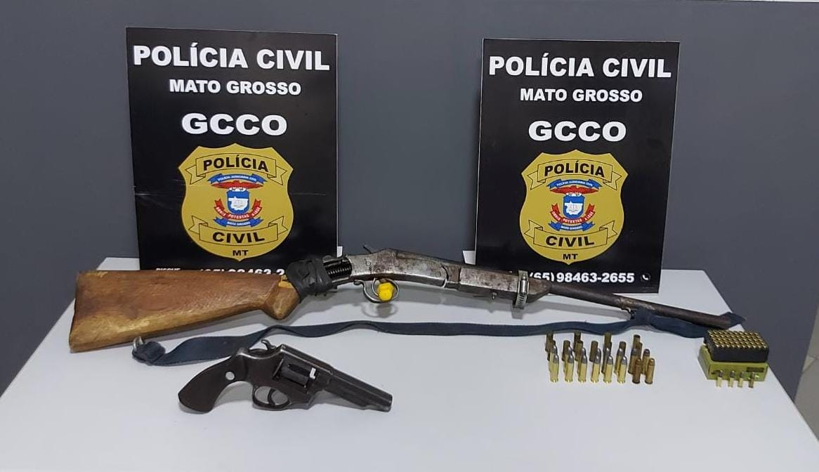 Duas armas de fogo e mais de 80 munições foram apreendidas pela Polícia Civil, nesta quarta-feira (20.07), em uma propriedade na zona rural de Rosário Oeste (128 km a médio-norte de Cuiabá), em ação realizada pela Gerência de Combate ao Crime Organizado (GCCO), Delegacia Especializada e Proteção à Pessoa (DHPP) e apoio do canil da Polícia Rodoviária Federal.Um homem de 66 anos, dono da propriedade rural foi autuado em flagrante pelos crimes de posse ilegal de arma de fogo e munições.