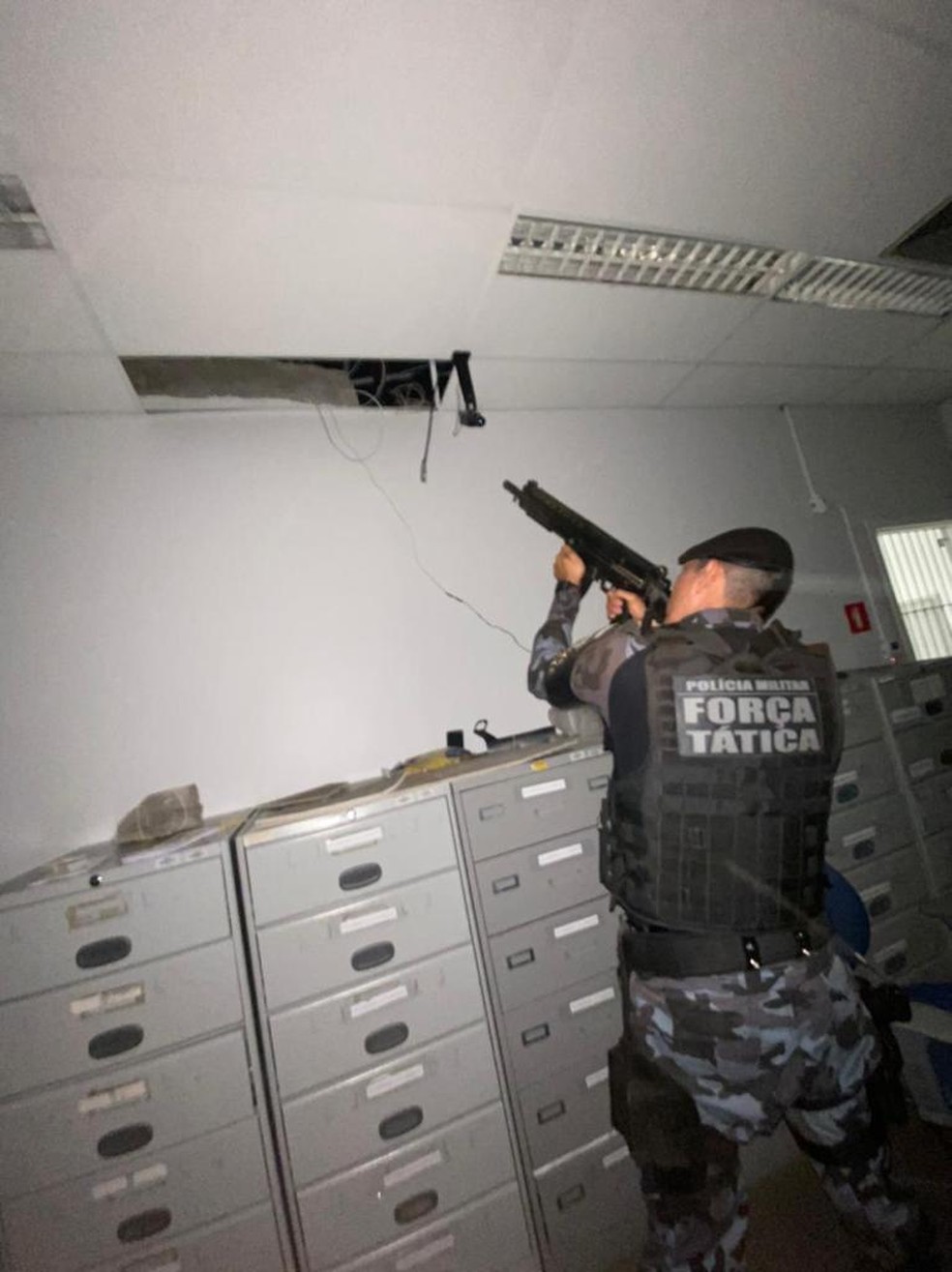 De acordo com a PM, parte do forro da agência foi danificada e o quadro de energia foi arrombado.