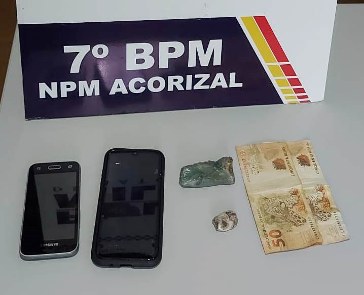 Policiais Militares de Acorizal após receberem informações de que 02 suspeitos ao qual estavam em motocicleta CG 125 Titan de cor vermelha haviam pegado alguma coisa em um lixeira nas proximidades da base PM e saindo em alta velocidade, e diante da informação a guarnição conseguiu abordar a referida motocicleta com os 2 suspeitos (ambos menores) e encontrando 01 trouxa contendo substância análoga a maconha, onde o suspeito declarou-nos de quem teria comprado e ainda informou o valor pago pelo entorpecente.
