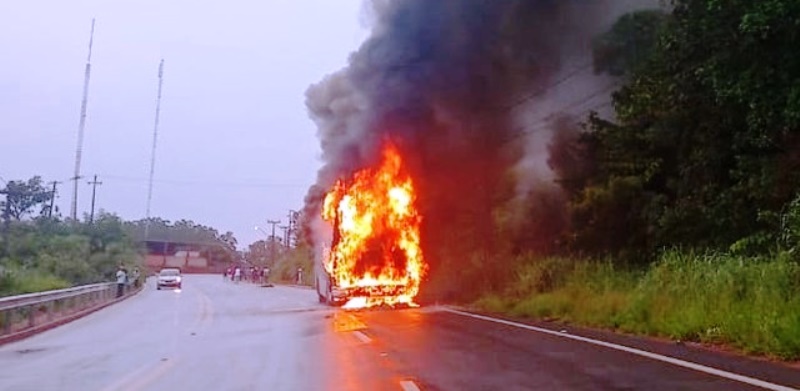 Um ônibus que transportava funcionários de uma empresa de alimentos em Diamantino, a km de Cuiabá, pegou fogo quando passava pela MT-240, na manhã nesta segunda-feira (7). Cerca de 40 pessoas estavam no veículo no momento do acidente, mas ninguém ficou ferido.