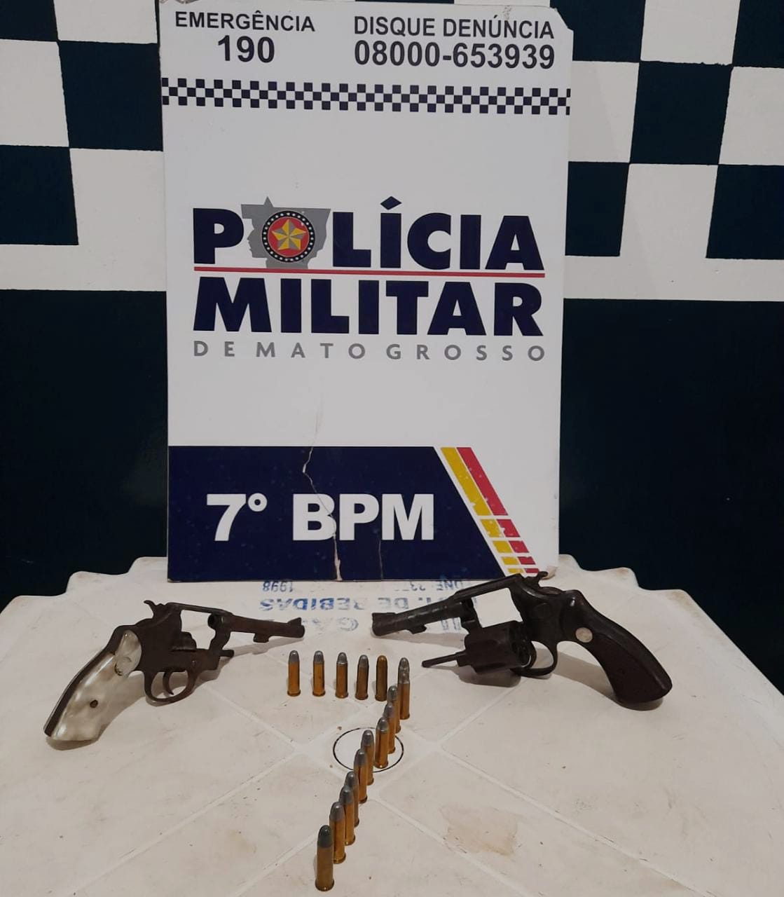 Na residência do suspeito foi encontrado uma arma de fogo calibre 32, um revólver calibre 38 de marca Taurus dentro de um saco plástico com 16 munições intactas.