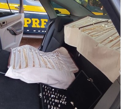 Diante disso, foi realizada uma busca mais detalhada no veículo, vindo a ser encontrado um fundo falso no banco traseiro, o qual foi aberto com ajuda do motorista. Dentro do compartimento havia grande quantidade de joias em ouro.