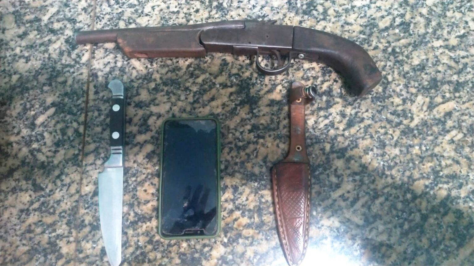 Seguido o protocolo, os policiais realizaram uma abordagem e uma revista pessoal no suspeito, identificado como Jezuete Pedro dos Santos, 45 anos, e localizaram na cintura dele, uma espingarda garrucha de um cano (o qual estava cerrado) e aparentando ser de calibre 36,municiada bem como uma faca e por esta razão foi dada voz de prisão a ele, que resistiu, sendo necessário os policiais fazerem uso moderado da força para poder algemar este suspeito, que acabou tendo escoriações leves pelo corpo do mesmo devido a sua luta com os policiais.