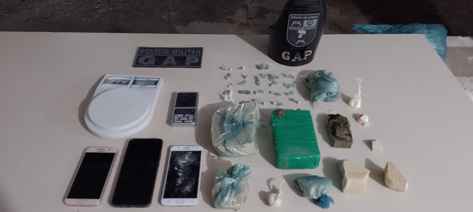 Com eles foram apreendidos uma quantia de 840 gramas de pasta base, maconha, três aparelhos celulares e uma balança de precisão.
