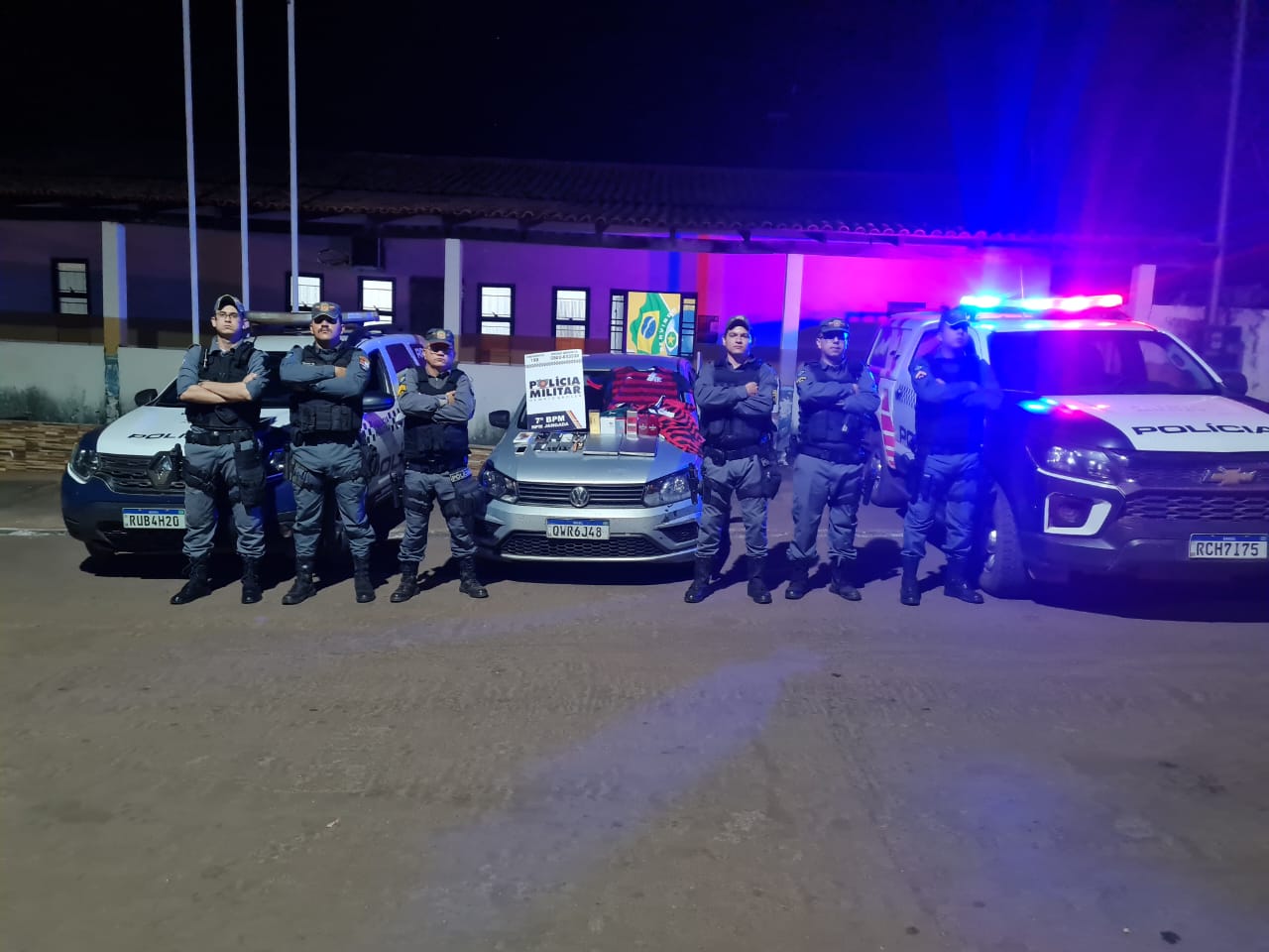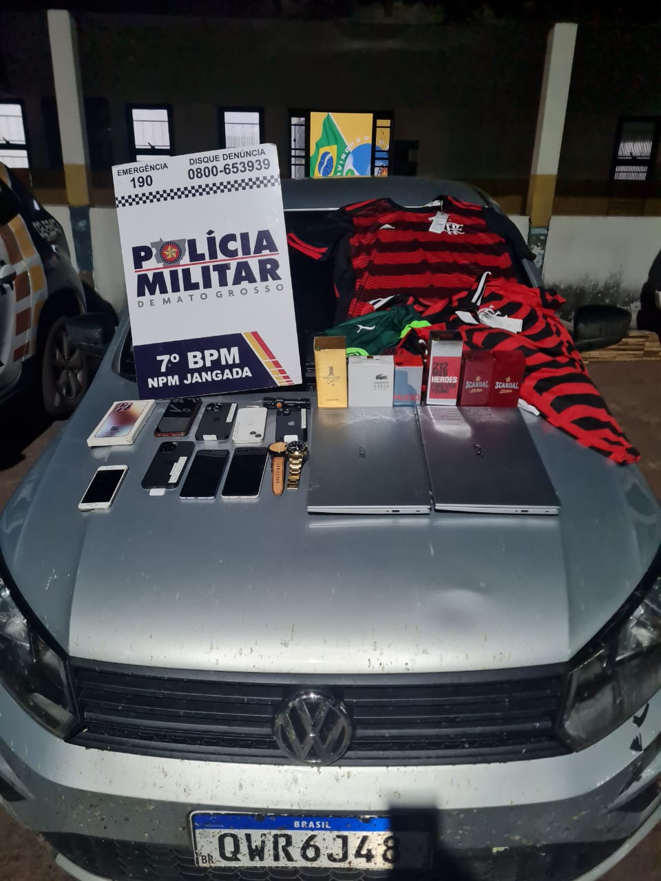 A PM logrou êxito em abordar o referido veiculo estando três suspeitos no interior do mesmo, ao realizar busca veicular foram localizados vários objetos, perfumes, roupas, celulares com etiquetas e lacrados.