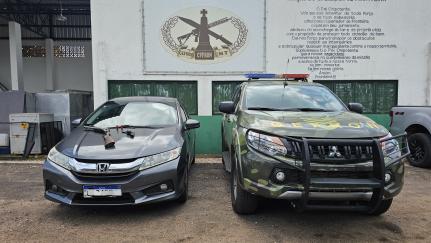 Durante patrulhamento na BR-174, os policias localizaram os suspeitos na rodovia. Eles abandonaram o carro no acostamento e fugiram pela mata assim que avistaram a equipe.