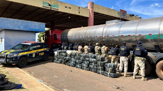 A Polícia Rodoviária Federal (PRF) apreendeu 878 quilos de entorpecentes escondidos em uma carreta Scania que carregava oléo vegetal. O motorista foi preso. O caso foi registrado na rodovia federal BR-163, em Nova Mutum (240 km de Cuiabá), na quarta-feira (5).