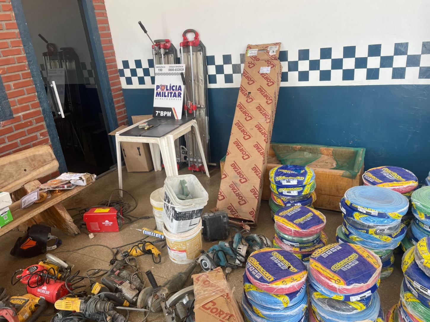 Com base nas informações recebidas, a equipe iniciou diligências e, durante patrulhamento pela BR-163/364, no entroncamento com a Avenida Castelo Branco, avistou o veículo suspeito — um Mercedes Benz 710 — estacionado no Centro de Rosário Oeste. Ao abordar o caminhão, os policiais encontraram os materiais furtados em seu interior.