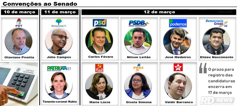 Também no dia 12, o Podemos oficializa o deputado federal José Medeiros na disputa pelo Senado. A convenção está marcada para 19h30, no Hotel Fazenda Mato Grosso.
