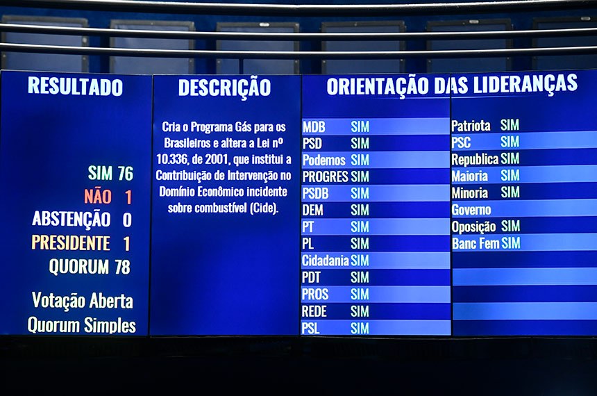 Por 76 votos favoráveis e um voto contrário, o Senado aprovou, nesta terça-feira (19), o substitutivo ao projeto de lei que cria subsídio destinado a famílias de baixa renda para a compra de botijões de gás de cozinha. O texto retornará à Câmara dos Deputados.