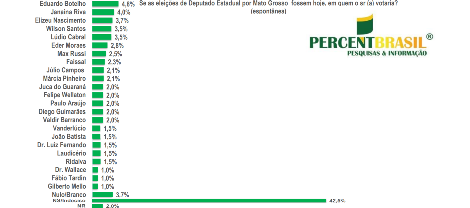 Se as eleições para deputado estadual fossem hoje, o atual presidente da Assembleia Legislativa, Eduardo Botelho (União Brasil), seria o candidato a deputado estadual mais votado da Baixada Cuiabana com 4,8% de preferência popular.