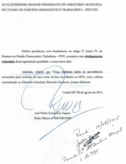 Confira, abaixo, a carta de desfiliação de Taques.