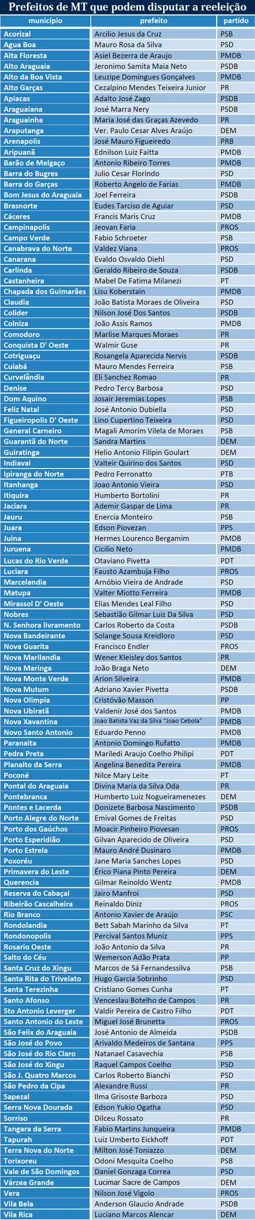 Na lista de quem pode ir à reeleição figuram prefeitos com três ou mais mandatos, como Érico Piana (Primavera do Leste), Percival Muniz (Rondonópolis), Otaviano Pivetta (Lucas do Rio Verde), Adriano Pivetta (Nova Mutum) e Maia Neto (Alto Araguaia). E existem outros que entraram há poucos meses, como Lucimar Campos (Várzea Grande), Paulo Cesar (Araputanga) e Lisu Koberstain (Chapada dos Guimarães).