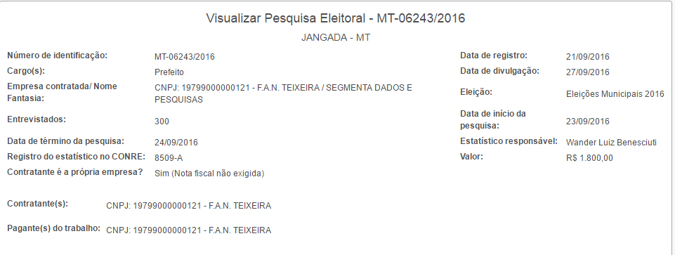 Já na reta final da campanha, a primeira pesquisa eleitoral foi registrada no Tribunal Superior Eleitoral (TSE) para o município de Jangada. A empresa F.A.N. Teixeira / Segmenta Dados e Pesquisas registrou a pesquisa n° 06243/2016, no dia 21 de setembro, e entrevistou 300 pessoas entre os dias 23 e 24. Os dados deverão ser divulgados no dia 27.