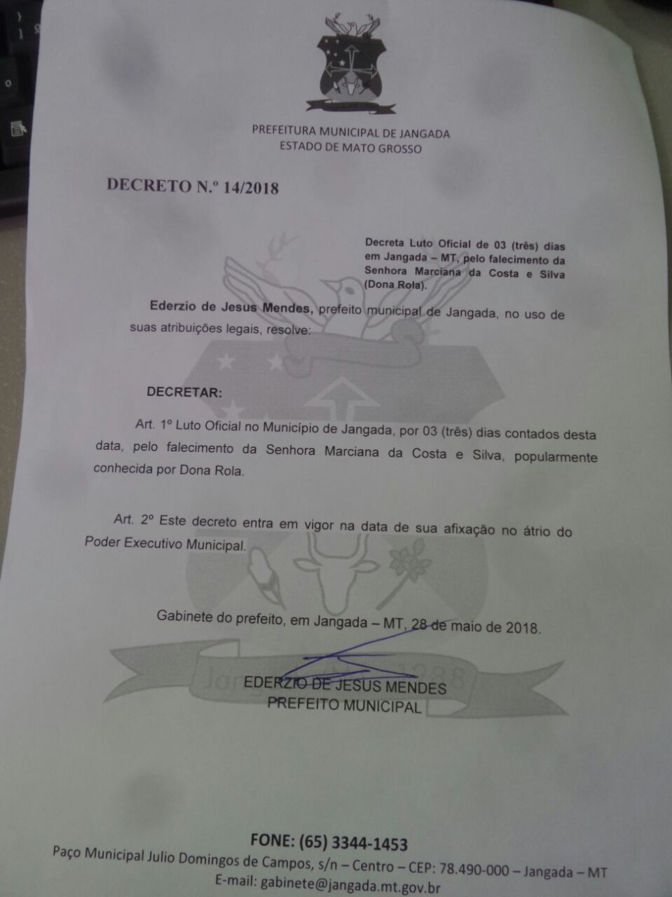 O prefeito Garrincha Mendes decretou luto oficial de 3 dias em Jangada/MT em razão do falecimento de Marciana da Costa e Silva, popularmente conhecida como Dona Rola, ocorrido na madrugada desta segunda-feira (28).