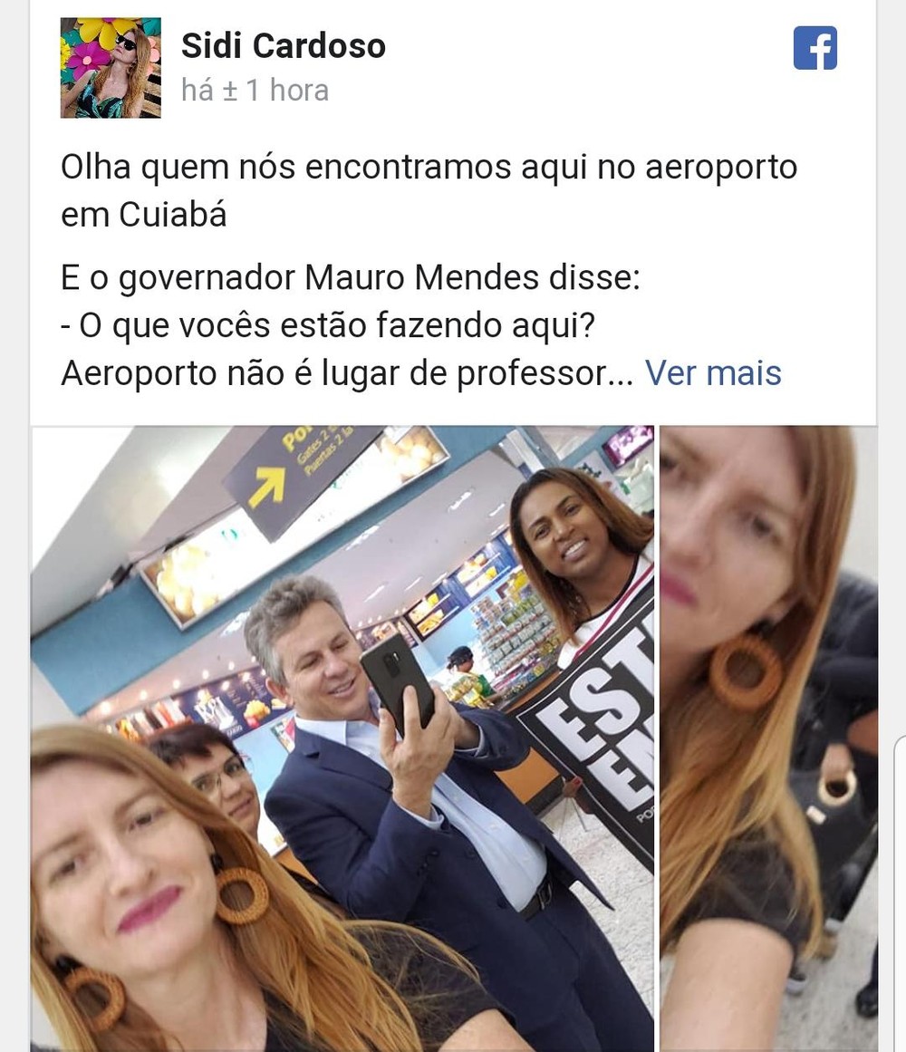 A professora Sidiney Cardoso, que dá aula para crianças do ensino fundamental, na Escola Estadual Professor Edeli Mantovani, em Sinop, a 503 km de Cuiabá, aproveitou e levantou o cartaz com a seguinte frase: 'Estamos em greve', ao se encontrar com o governador Mauro Mendes (DEM), nessa terça-feira (25), no Aeroporto Marechal Rondon, em Várzea Grande, região metropolitana de Cuiabá.